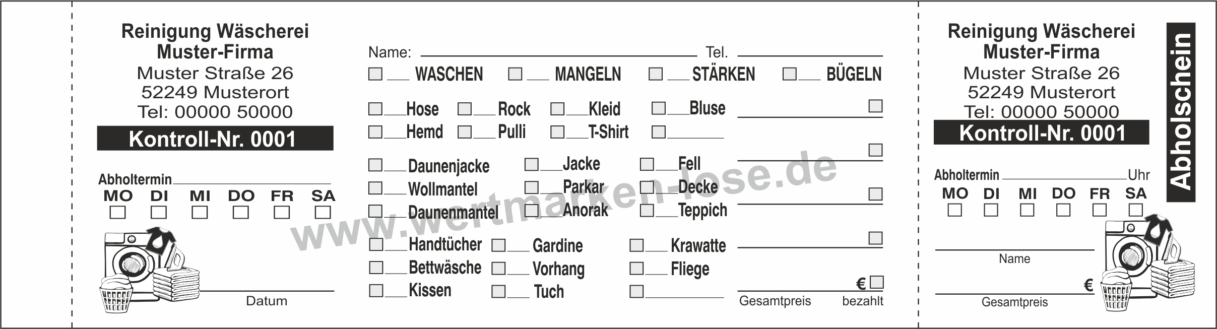 1000 Abholscheine "Waschmeister-Reinigung-Wäscherei", individuell