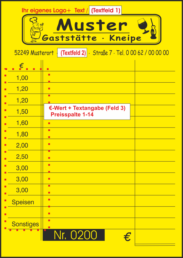Texteindruck: Name Gaststätte, Anschrift, 14 x Preis- Textfelder (16 Textzeichen) + Logo